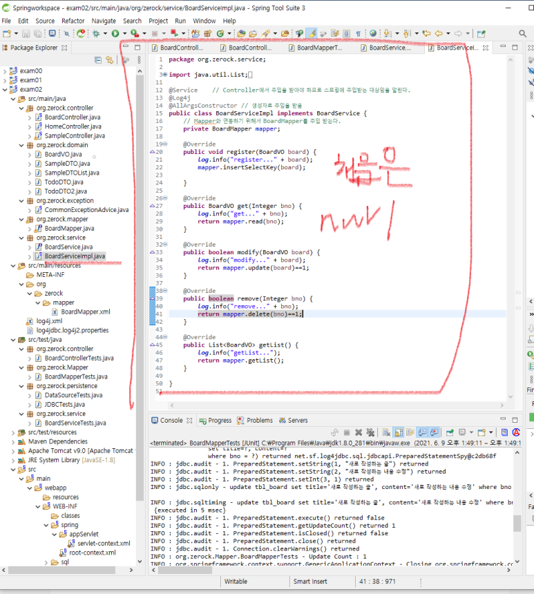 3. 이제 BoardServiceImpl.java 의 각 기능들에 대해서 구현과 테스트를 할 차례입니다.
