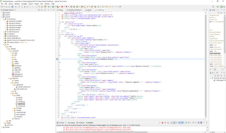 5. views/board/modify.jsp 를 생성합니다. ( register.jsp를 복사해서 내용을 수정합니다.)