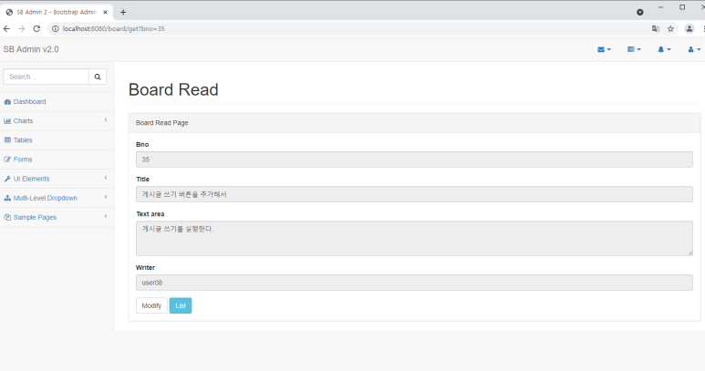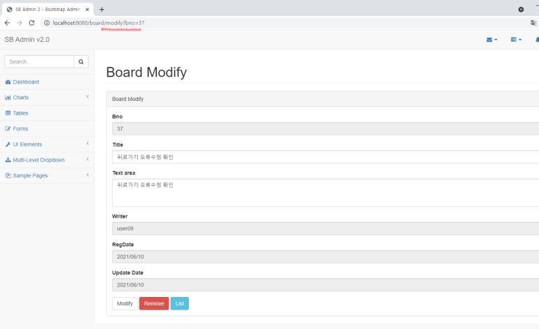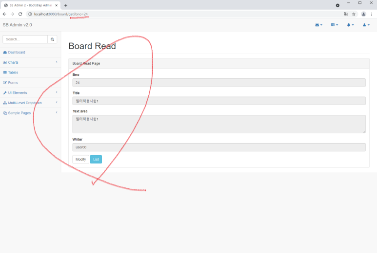 게시글 보기(get.jsp)에서 Modify 버튼을 누르면