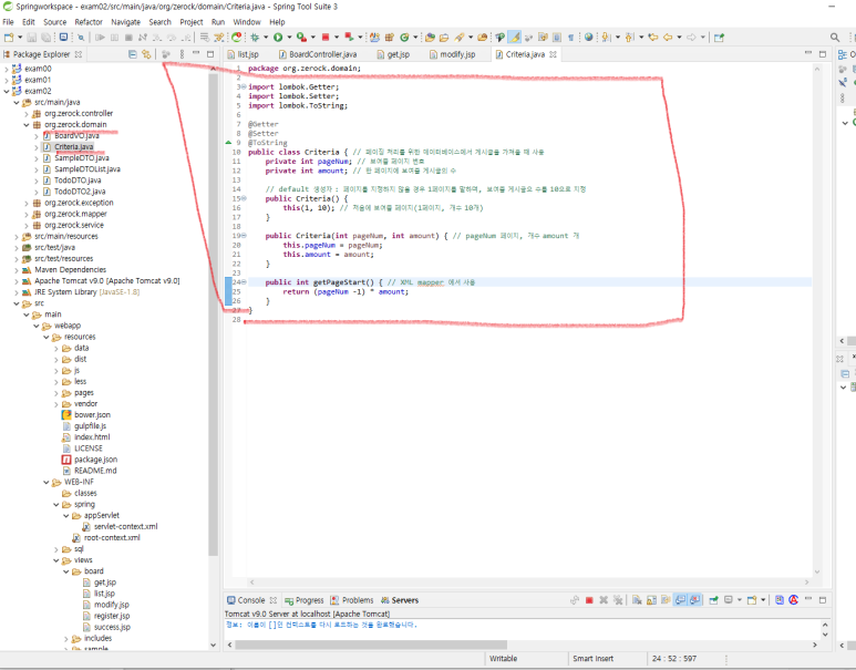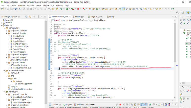1) BoardController.java의 @getMapping list()를 Criteria cri 를 가져올 수 있도록 수정합니다.