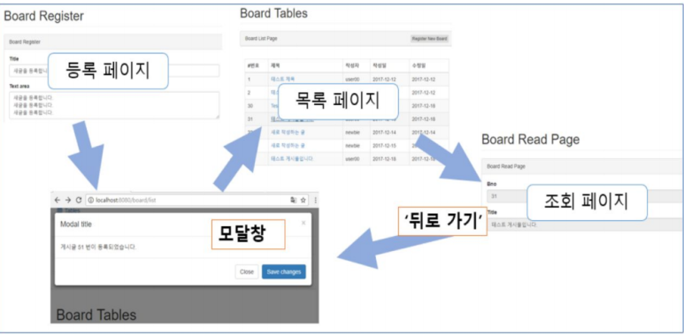 1) 게시글을 등록(등록페이지 register)하고 모달창이 나온 후에, 목록 페이지(list)에서 게시글을 조회(get)