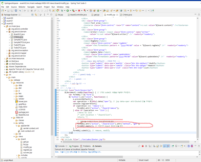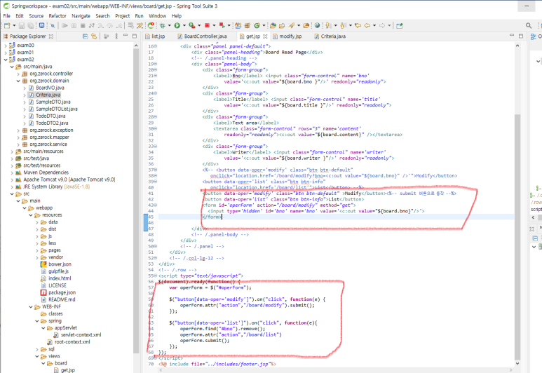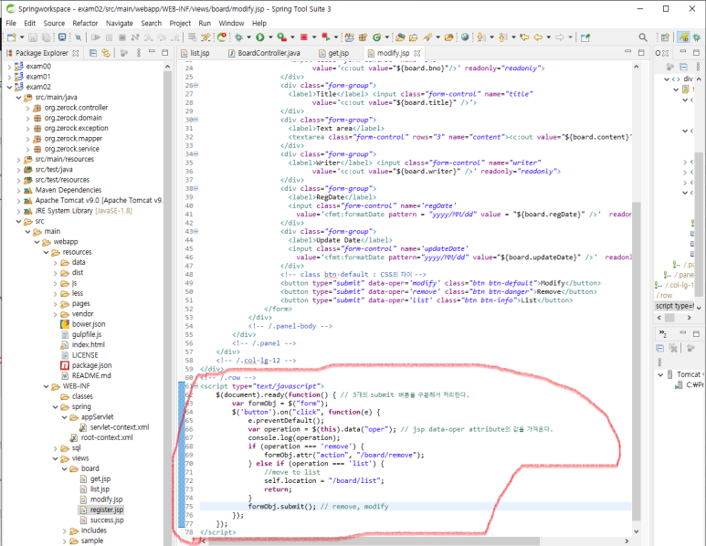 6. Modify.jsp 에서 버튼(Modify, Remove, List)에 따라 다른 작동을 하기 위해 Modify.jsp에 자바스크립트를 작성합니다.