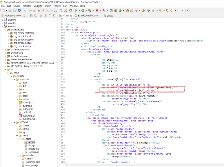 1. 목록에서 조회페이지로 이동하기 위해 list.jsp 에 {board.title}에 <a>태그로 '/board/get?bno'로