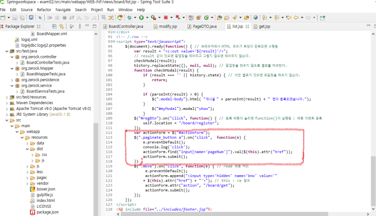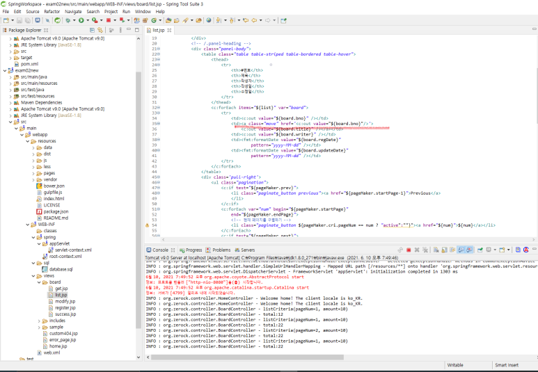 1. list.jsp 에 BoardController.java 에서 Addattribute(pageMaker)한 것을 가져오기 위한 코드를 작성합니다.