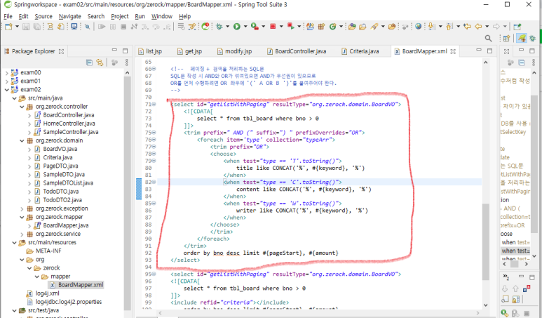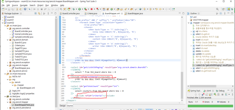 2. BoardMapper.xml의 getTotalCount sql 과 getListWithPaging 부분에 해당 쿼리 부분이 필요한 부분에 <include>합니다.