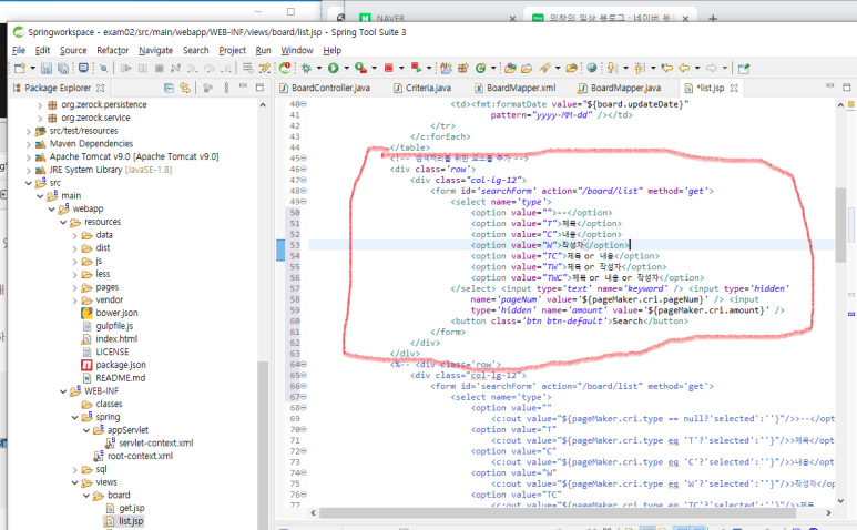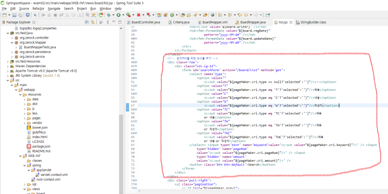 4. list.jsp에서 검색조건과 키워드를 보여주는 부분을 수정합니다.