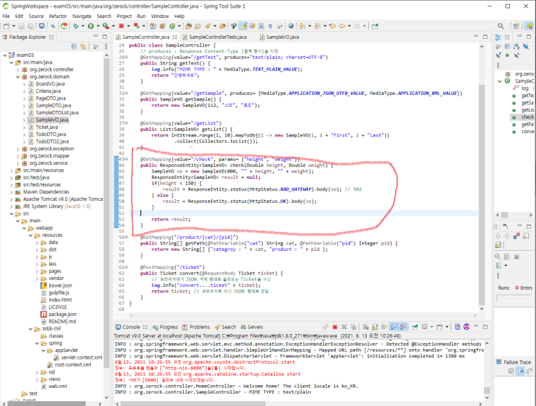 2. SampleController.java 에 check() 메소드를 추가합니다.