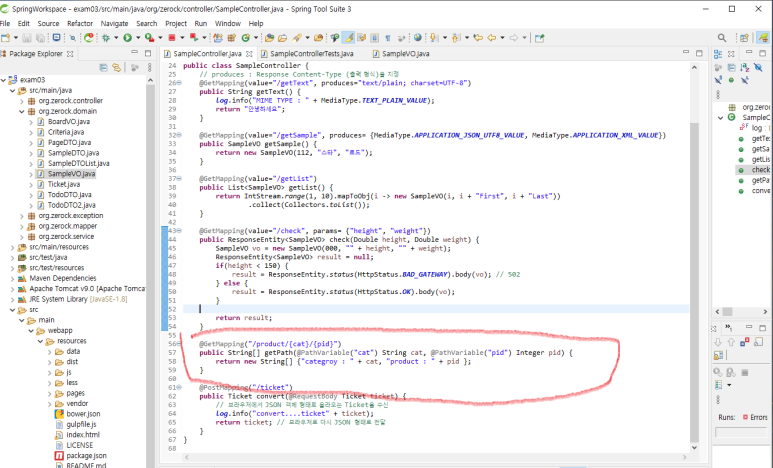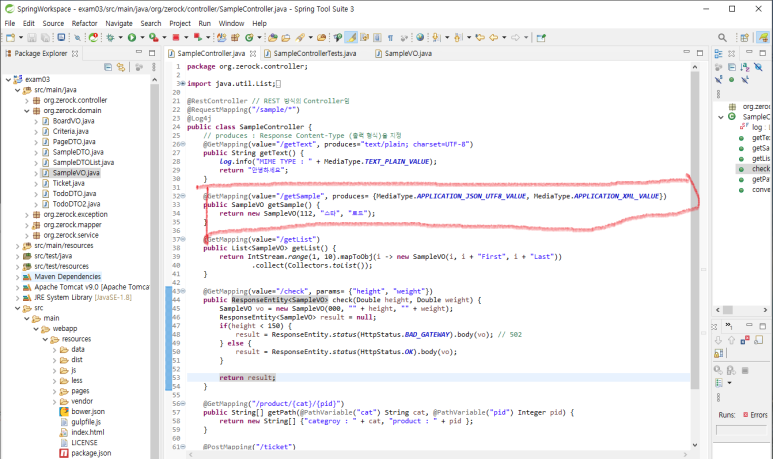 1. 이번에는 JSON 혹은 XML로 데이터를 변환하기 위해 SampleVO.java를 만들고 SampleController 에 다음과 같이 작성합니다.