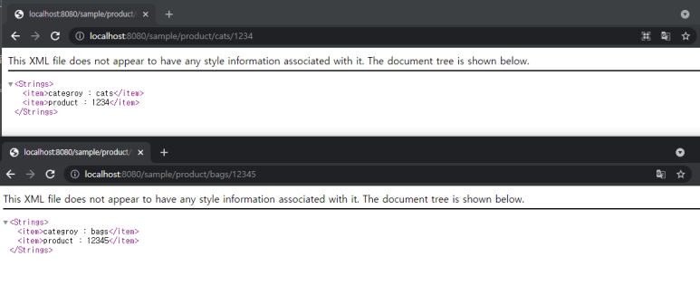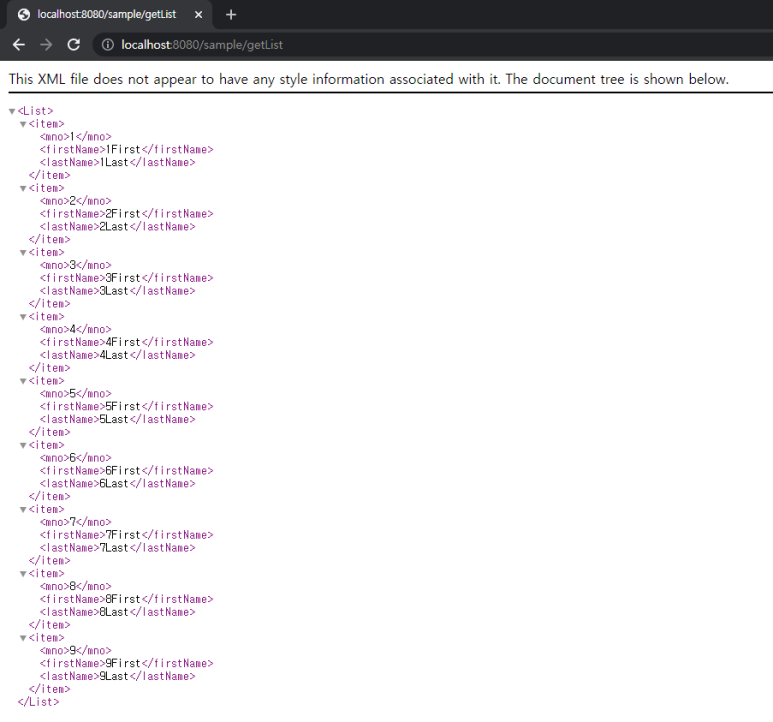 1) 주소창에 한번은 localhost:8080/sample/getSample 을(XML)