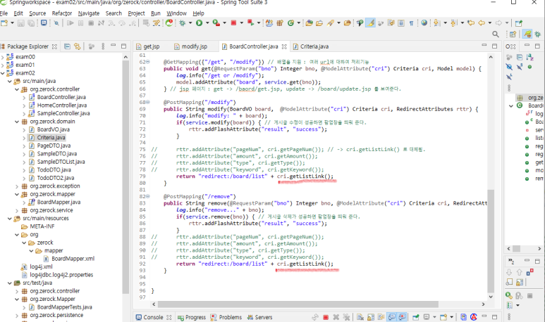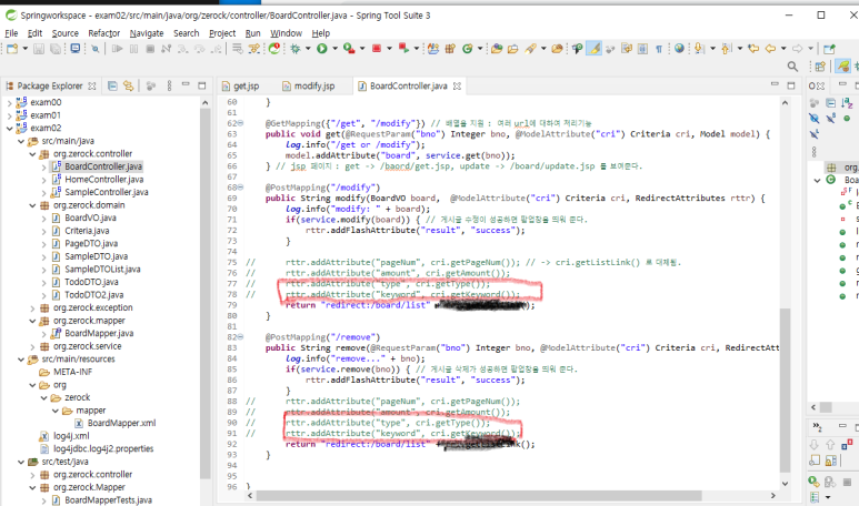 2) modify가 동작하는 BoardController.java 의 modify()와 remove() 부분도 수정합니다.