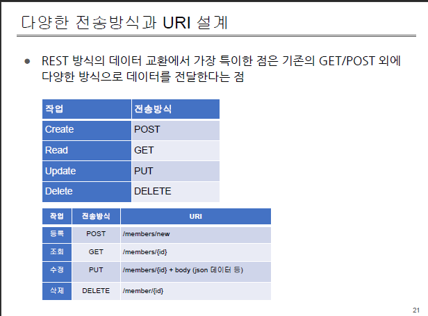(2) GET/POST 외에 PUT/DELETE 등의 다양한 전송방식 사용
