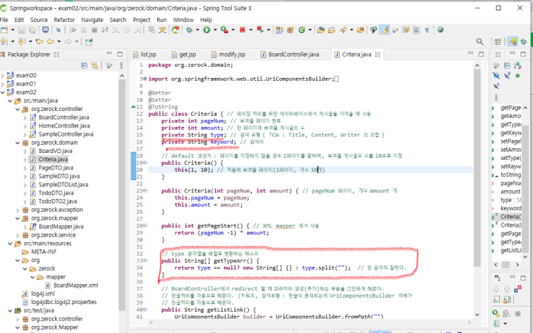 1. Criteria.java 클래스에서 검색항목(type)과 검색키워드(keyword)를 추가합니다.