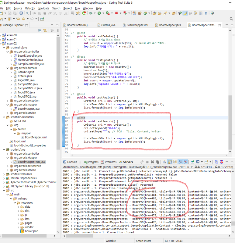 ※ 그런데 이러면 확장성이 너무 떨어집니다. 게시물의 검색과 게시물의 숫자 카운트에 공통으로 사용되는 부분이 언제든지 사용될 수 있으므로 <sql> 조각으로 분리하고, 필요한 곳에 <include>하는 방식으로의 모듈화가 필요합니다.