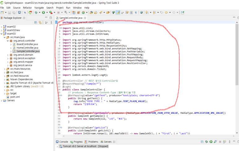 새로운 SampleController.java를 만든 후 다음과 같이 작성합니다.