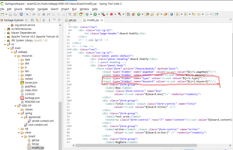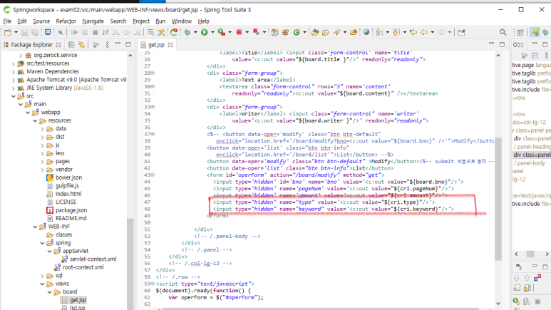 1. 게시글 리스트에서 특정 게시글 선택 시 게시글 상세보기로 이동하는데, 게시글 수정 버튼을 누르면 검색 유형(type)과 검색어(keyword)가 전달되어야 합니다. 즉, get.jsp(조회화면)에서도 현재 객체(cri)의 keyword 와 type을 받아야 합니다.