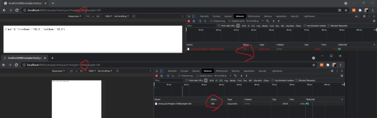 1) height 값이 150보다 작으면 BAD를, 150이거나 크면 200(OK)를 주므로 주소창에