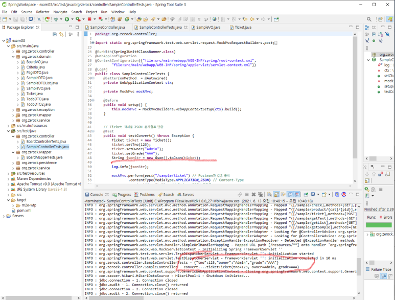 3) Ticket 클래스를 생성하고, SampleController.java에 convert() 메소드를 정의하여 확인합니다.