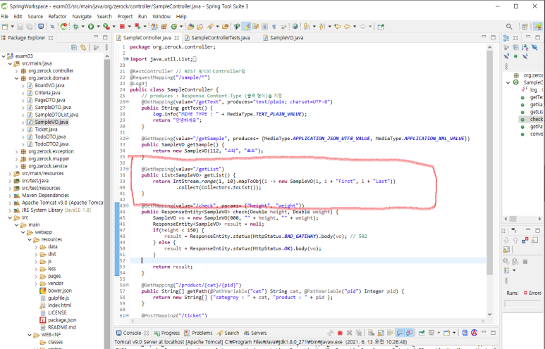 1. Collection 타입의 객체반환을 확인하기 위해 SampleController java에 getMap()을 작성합니다.