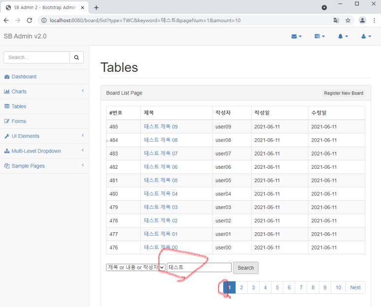 2) 화면에서 검색 버튼을 클릭하면 새로 검색을 한다는 의미로 1 페이지로 이동하여야 합니다.