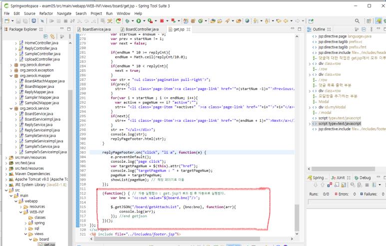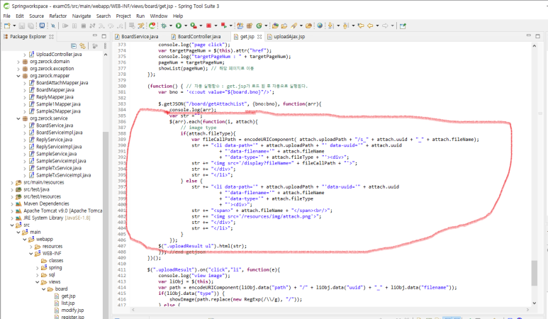 4. get.jsp javascript 부분에 첨부파일 정보를 가져오는 코드를 작성합니다.