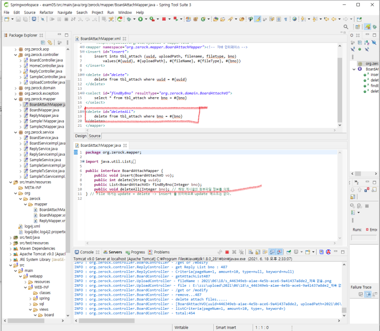 1. BoardAttachMapper 인터페이스에 첨부파일을 deleteAll() 하는 메소드를 추가하고