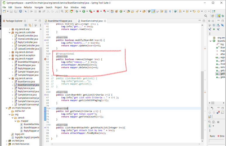 2. BoardServiceImpl.java 에 해당 비즈니스 로직을 처리하는 delete 메소드에 @Transactional(Aspect확인)