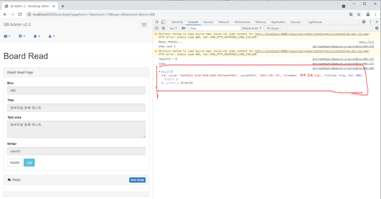 F12키를 눌러 콘솔창을 확인하면 해당 게시물(Bno)에 해당하는 첨부파일 정보가 나오는 것을 확인할 수 있습니다.