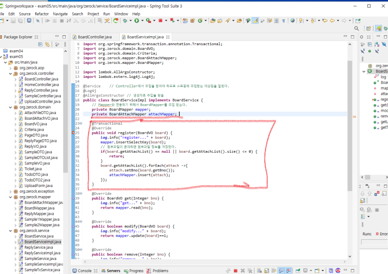 4. BoardServiceImpl.java 에 BoardAttachMapper attachMapper 객체를 추가하고 register 변수를 @Transactional(트랜잭션화) 하여 첨부파일이 존재하면 첨부파일 정보를 저장하도록 합니다.