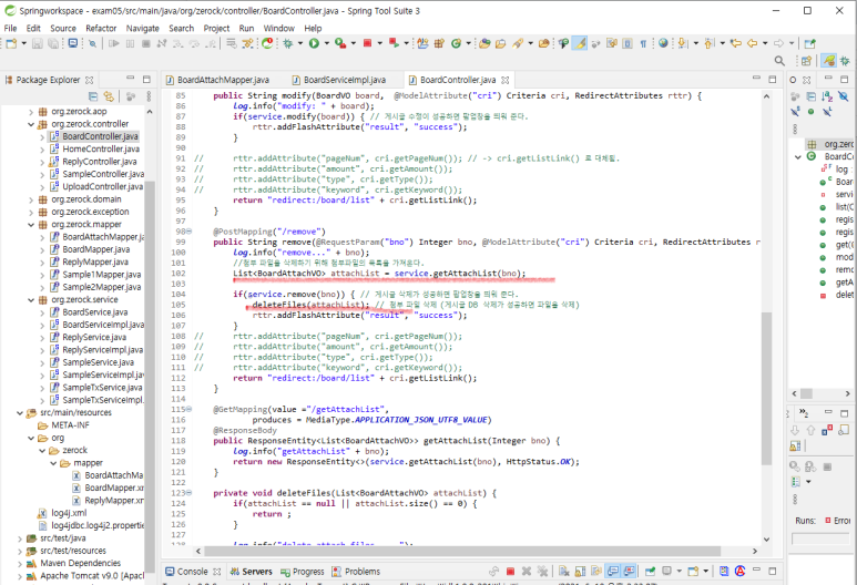3. BoardController.java의 remove() 메소드에 첨부파일을 삭제하는 코드를 추가합니다.