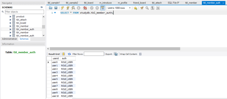 2. Spring Security를 위해 권한 정보를 저장하는 테이블을 생성합니다.