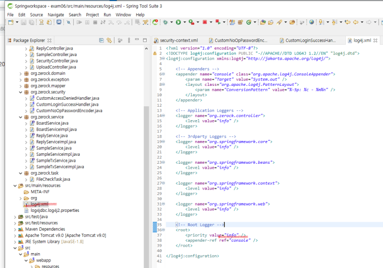src/main/resources/log4j.xml 에서 <root>의 <priority value="info"> 로 수정합니다.