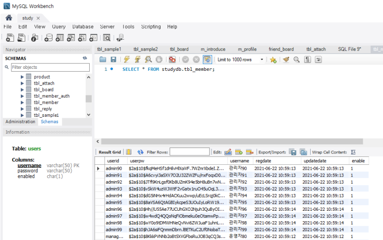 테스트 결과, 0부터 99까지 userid 와 username 이 for 문에 맞게, userpw가 암호화되어 insert 되었음을 확인할 수 있습니다.