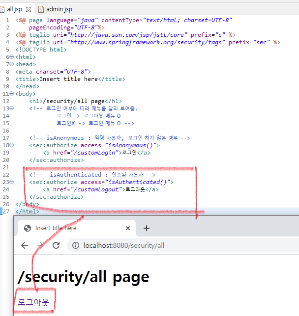 기존화면과 컨트롤러에 Security 관련 내용 추가