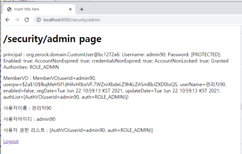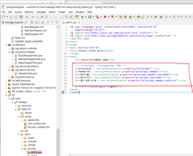 1. admin.jsp 에 principal(접근주체, 보호받는 Resource에 접근하는 대상, CustomerUser 객체)의 속성을