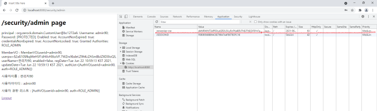 로그인 후 브라우저를 종료하고 다시 /security/admin에 접속하면 똑같은 Cookie : remember-me 값이 있음을 확인할 수 있습니다.