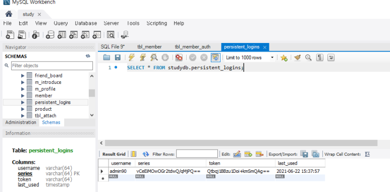 1) username = userid, token = cookie 값, last_used = 최종로그인 시간을 의미합니다.