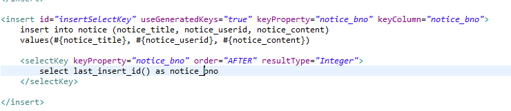 notice_bno 에 selectKey 구문의 결과가 셋팅되고