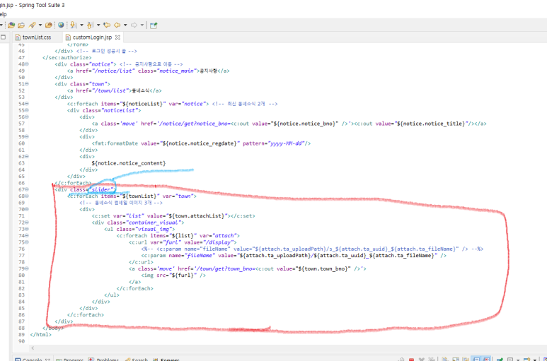 그 후, 배열형식으로 가져오는 코드 위에 <div>로 감싼 후 class="slider"를 추가합니다.