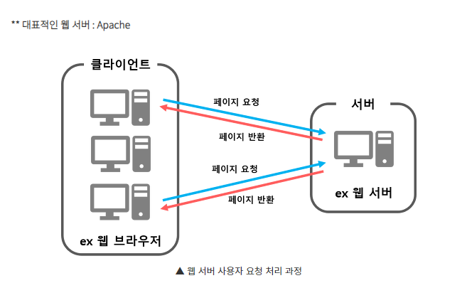 1. 클라이언트(사용자)가 웹 브라우저에서 어떠한 페이지 요청을 하면 웹 서버에서
